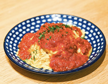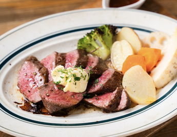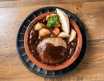 旨味たっぷりの肉汁を閉じ込めたハンバーグ。ナイフを入れるとその肉汁が溢れ出ます。お肉も手捏ねで丁寧に形どり、じっくり焼き上げる事でフワッとした食感に。 味も食べ応えも十分なハンバーグに仕上がりました。